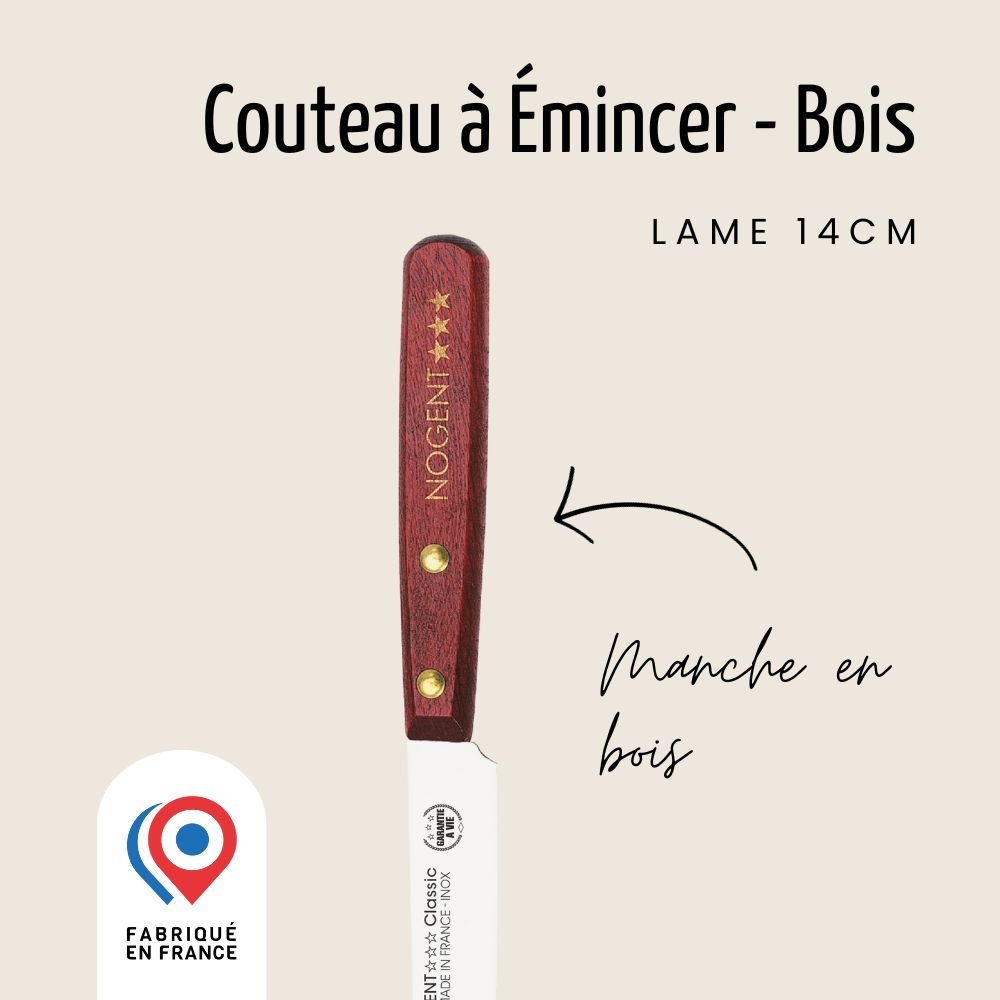Découvrez notre couteau éminceur Nogent ***, un mariage parfait entre la qualité des matériaux et le charme du bois. Dotée d’une lame lisse tranchante de 14 cm, cette pièce essentielle à votre cuisine offre une expérience de découpe nouvelle. La lame est en acier inoxydable trempé, meulée en biseau sur toute sa longueur. De plus, la lame est affilée manuellement pour une qualité de coupe excellente. Ce couteau éminceur coupe et découpe avec dextérité les viandes et légumes.