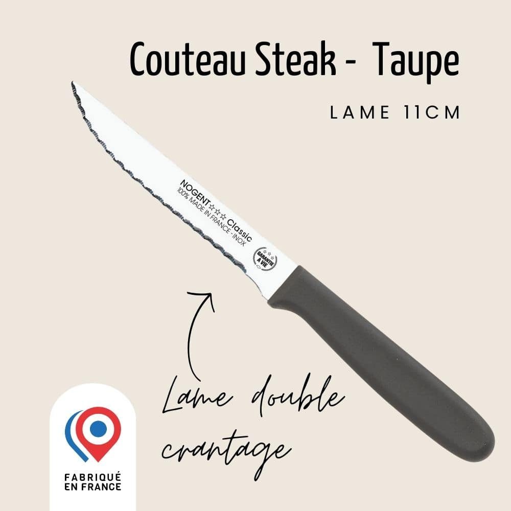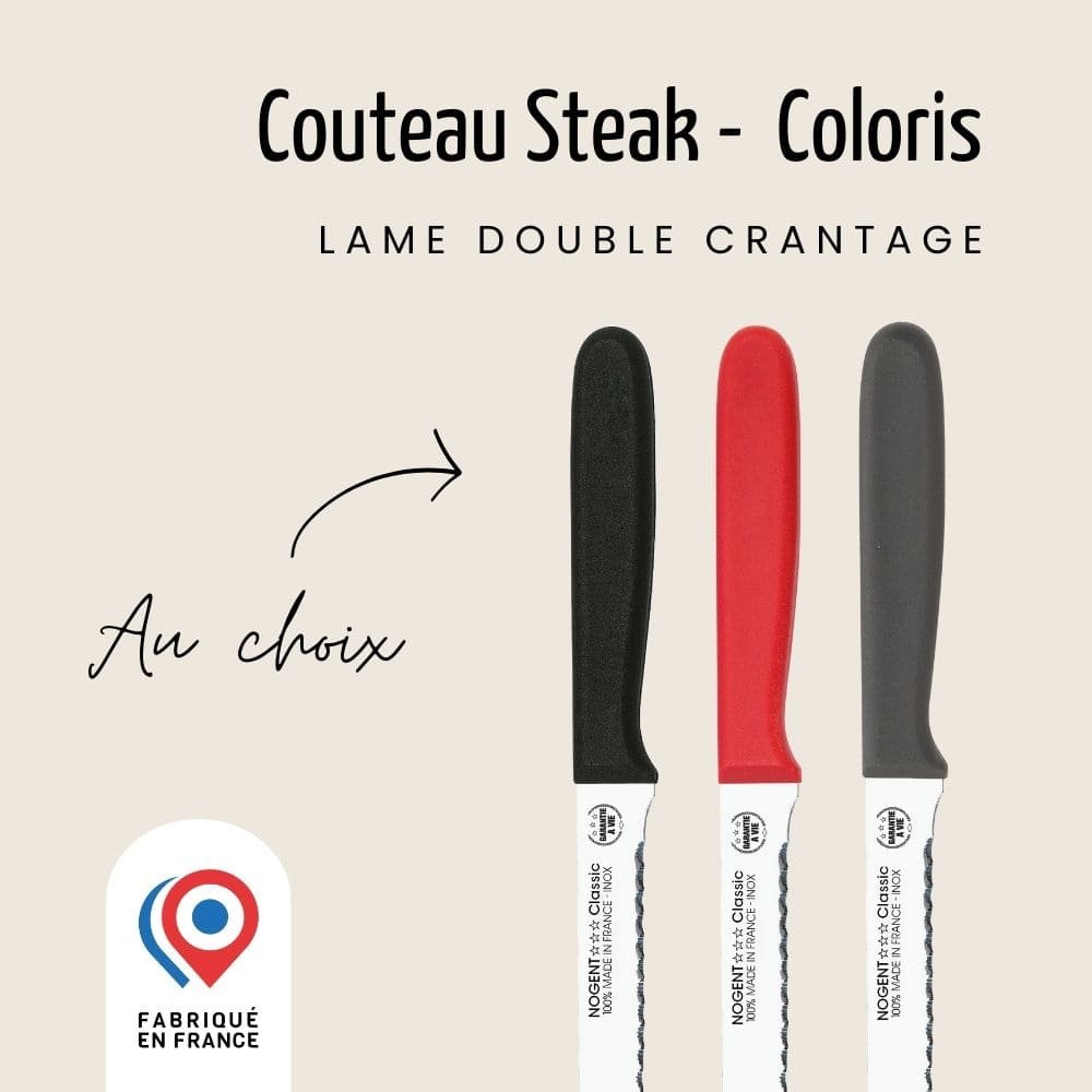 Optez pour les couteaux steak colorés de Nogent ***, leur lame de 11 cm double crantage sera parfaite pour vous accompagner dans la découpe de vos viandes et volailles. Il est compatible avec le lave-vaisselle.
