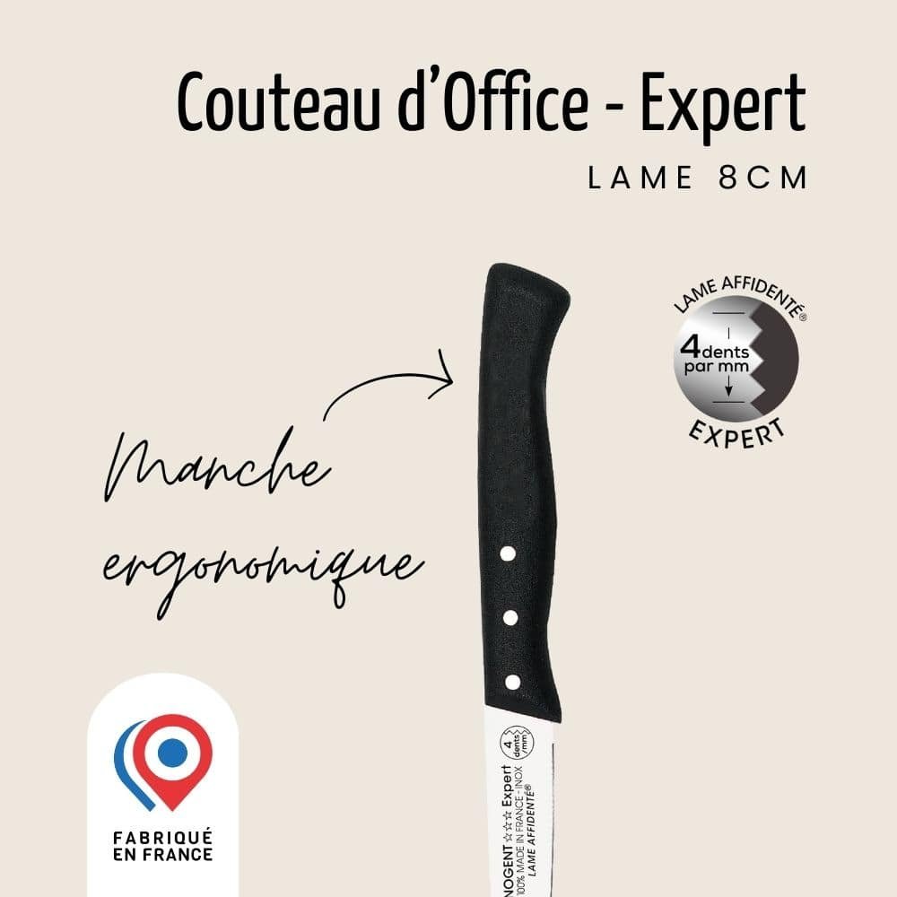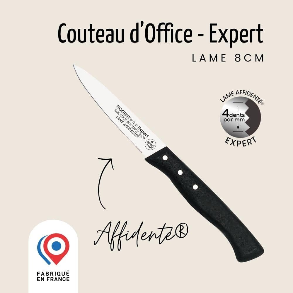 Notre couteau avec lame expert, la gamme Expert est un couteau d’office de 8cm possédant une technologie particulière, la technologie Affidenté®. Cette technologie offre 4 dents au mm, pratiquement invisible à l’oeil nu.. Le couteau d’office est le couteau à avoir dans sa cuisine. La technologie Affidenté® vient ajouter un confort de découpe dont vous ne pourrez plus vous passer.