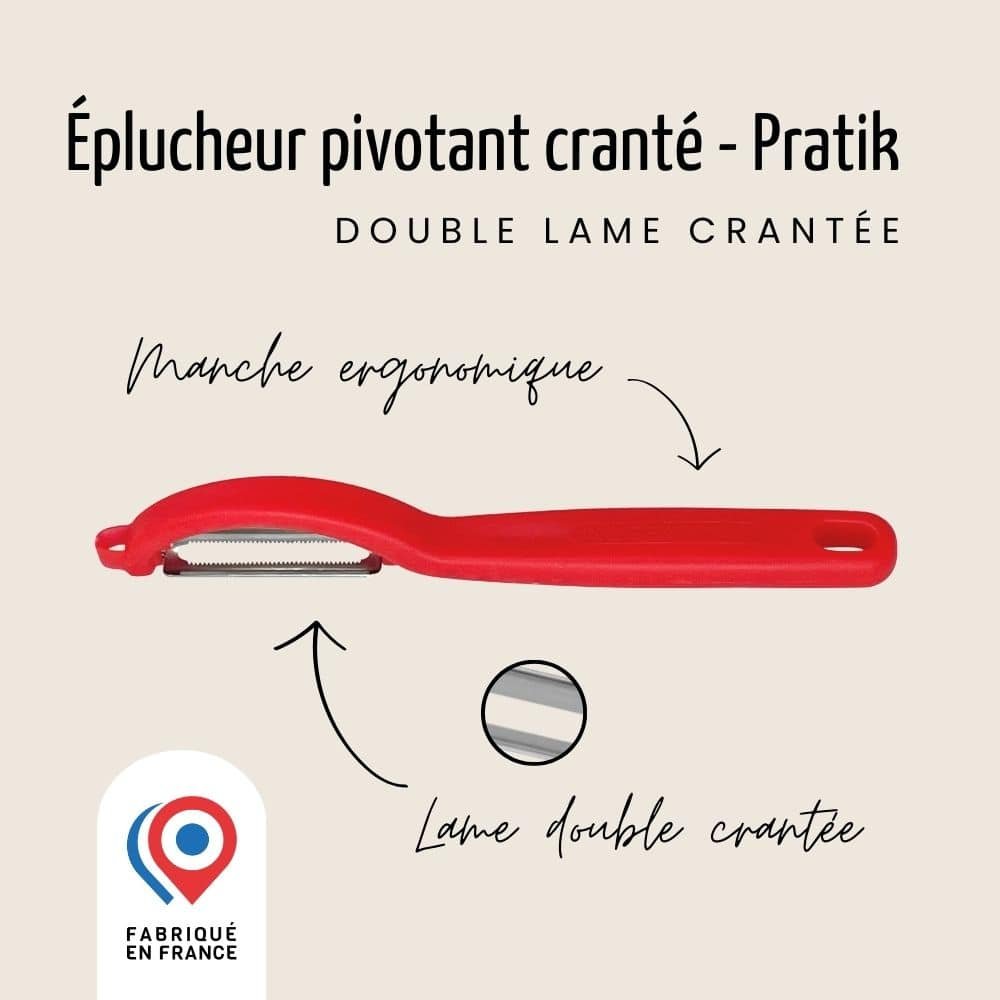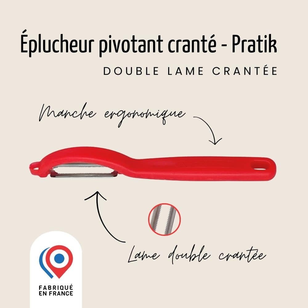 Cet éplucheur pivotant cranté, de forme “I” est doté d’une double lame crantée, conçu pour simplifier votre épluchage de fruits et de légumes à la chair tendre. Ses deux lames crantées incisent parfaitement la chair de vos aliments et sans gaspillage. Il passe au lave-vaisselle.
