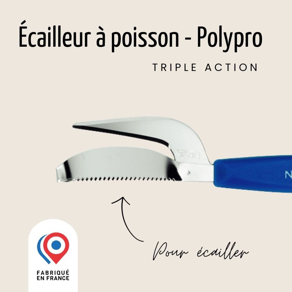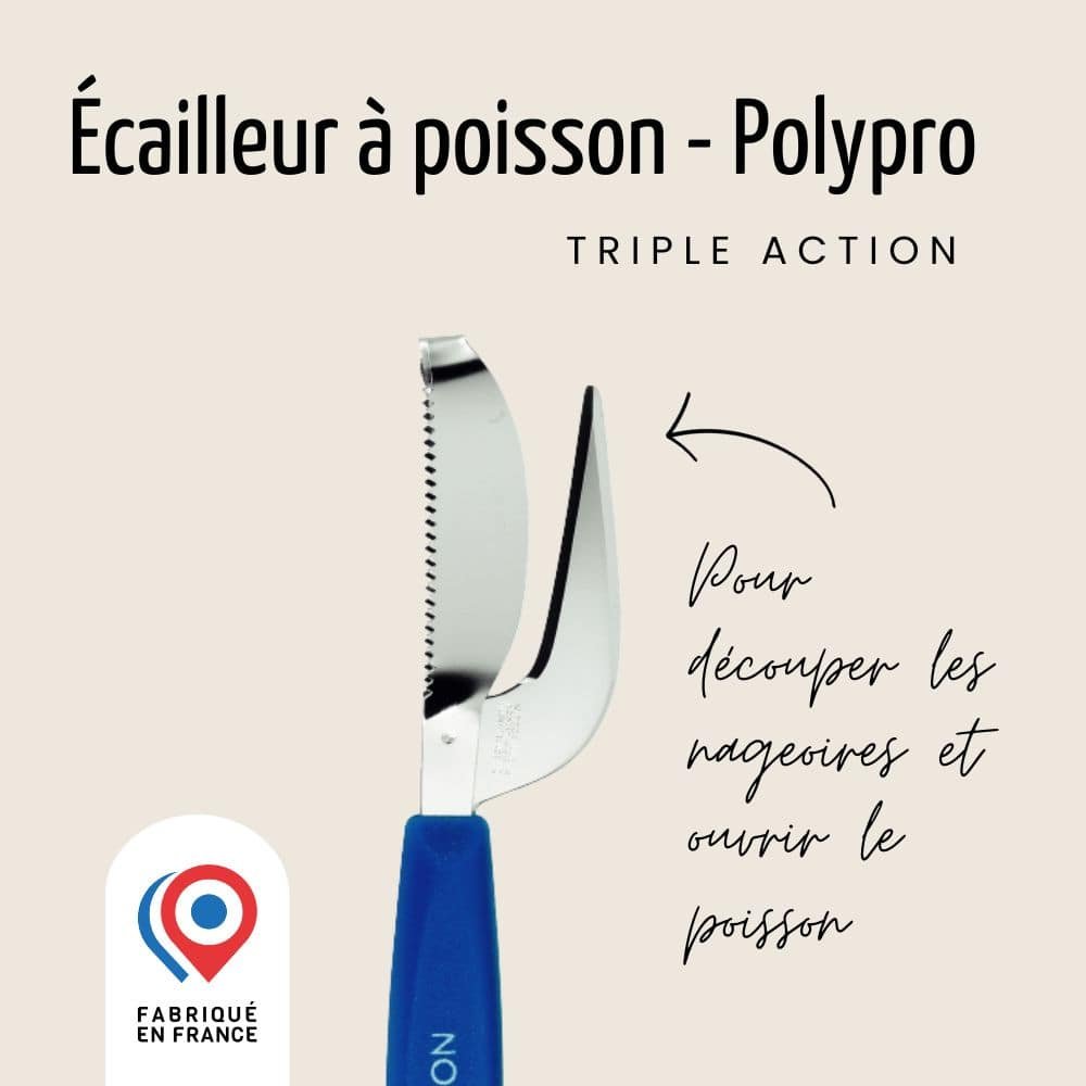 Le manche en polypropylène bleu ajoute une note de modernité à cet écailleur, offrant une prise en main confortable et ergonomique. Fabriqué avec soin en France, cet écailleur marie savoir-faire traditionnel et innovation, faisant de lui l’outil incontournable pour tous les amateurs de cuisine iodée. Optez pour la qualité et la performance avec notre écailleur à poisson Nogent *** triple action, votre allié essentiel pour sublimer vos plats à base de poisson.